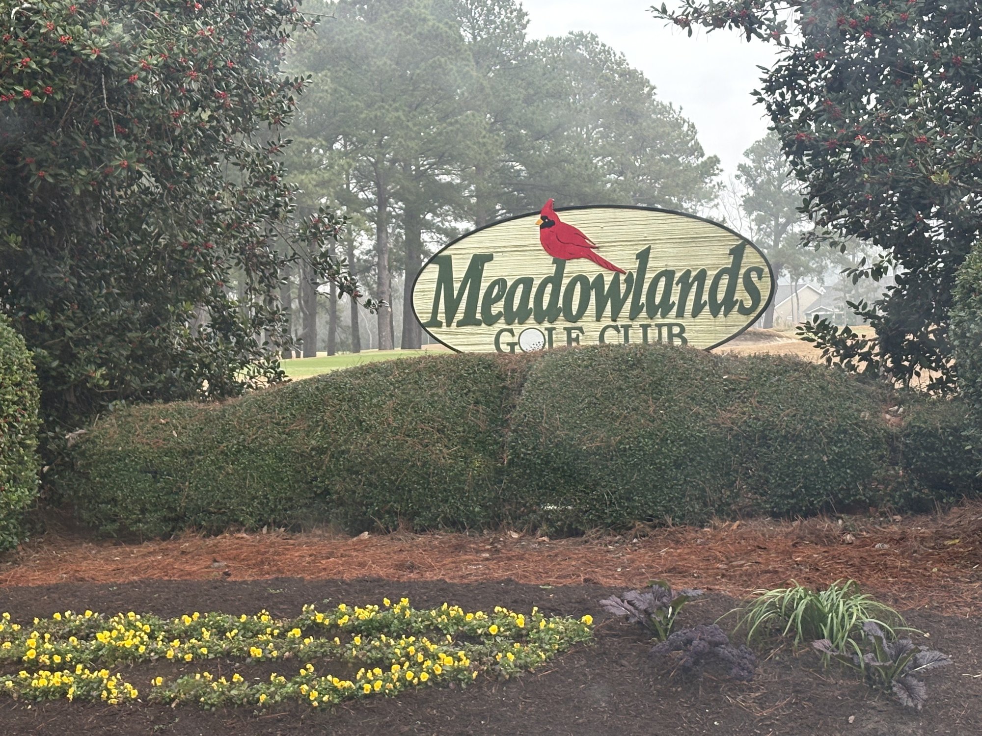 Meadowlands Golf Club entrance sign with cardinal logo in Calabash NC